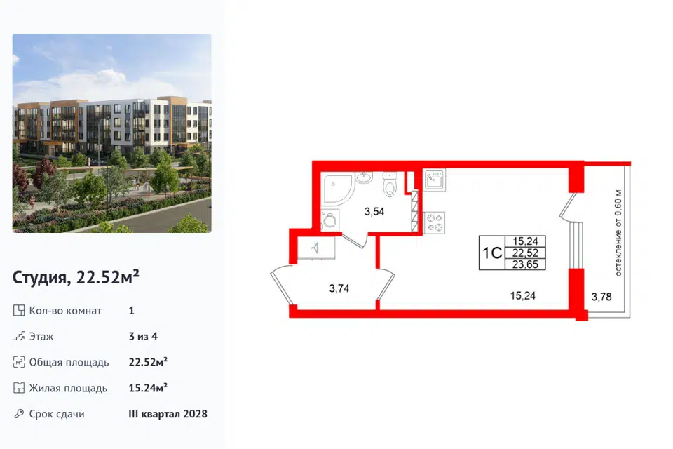Студия, 22.52 м², 3/1 этаж
