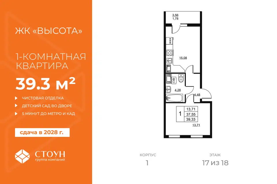 1-комн. кв., 39.33 м², 14/19 этаж