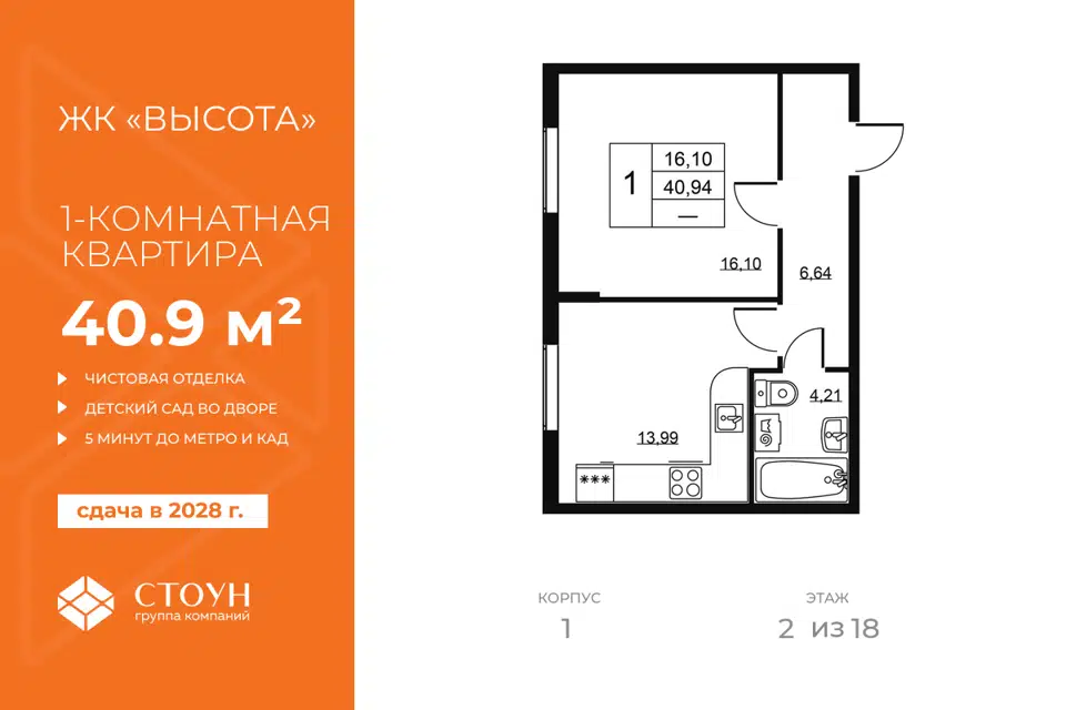 1-комн. кв., 40.94 м², 2/19 этаж