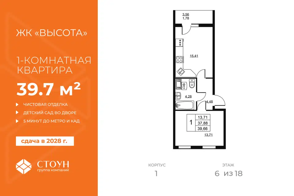1-комн. кв., 39.66 м², 4/19 этаж