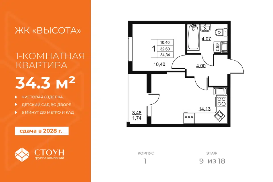 1-комн. кв., 34.34 м², 3/19 этаж