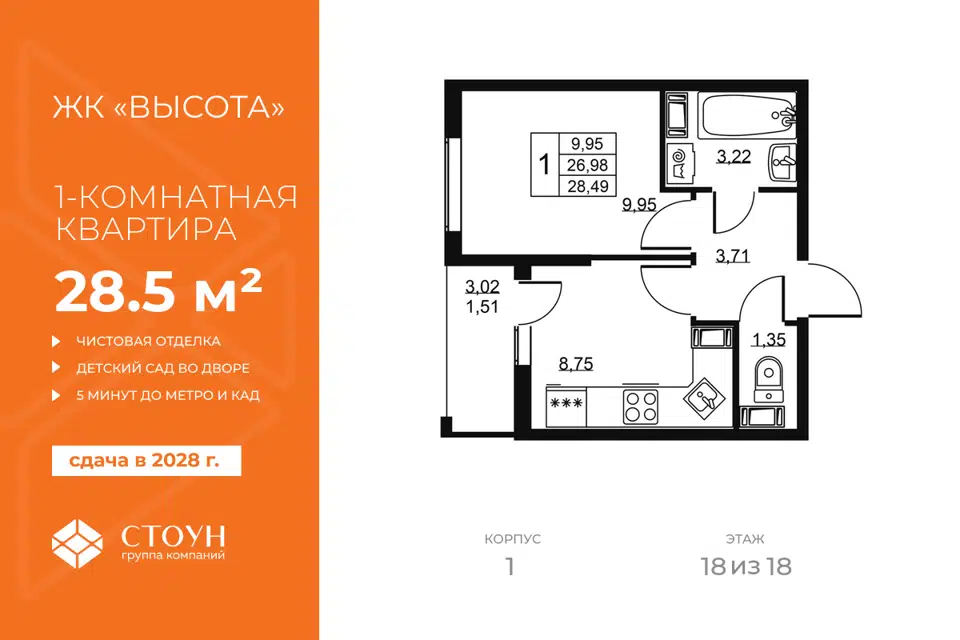 1-комн. кв., 28.49 м², 16/19 этаж