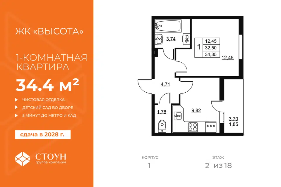 1-комн. кв., 34.35 м², 2/19 этаж