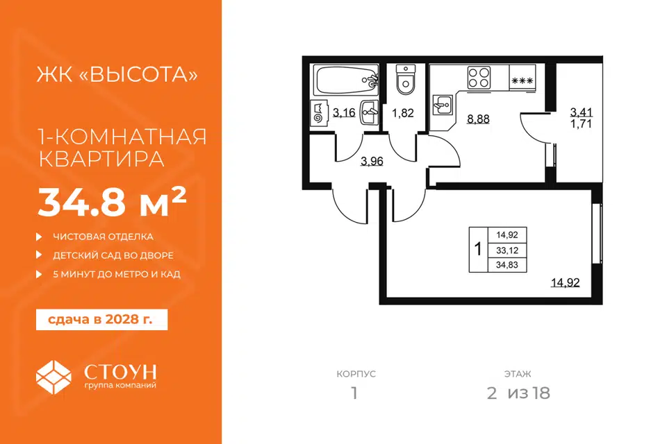 1-комн. кв., 34.83 м², 2/19 этаж