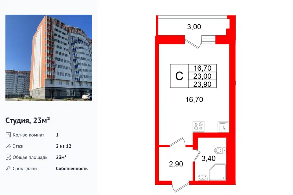 Студия, 23 м², 2/12 этаж