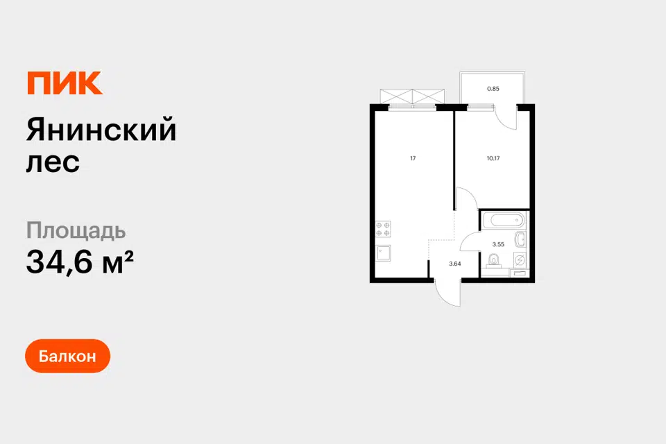 1-комн. кв., 34.8 м², 4/15 этаж