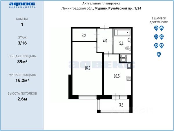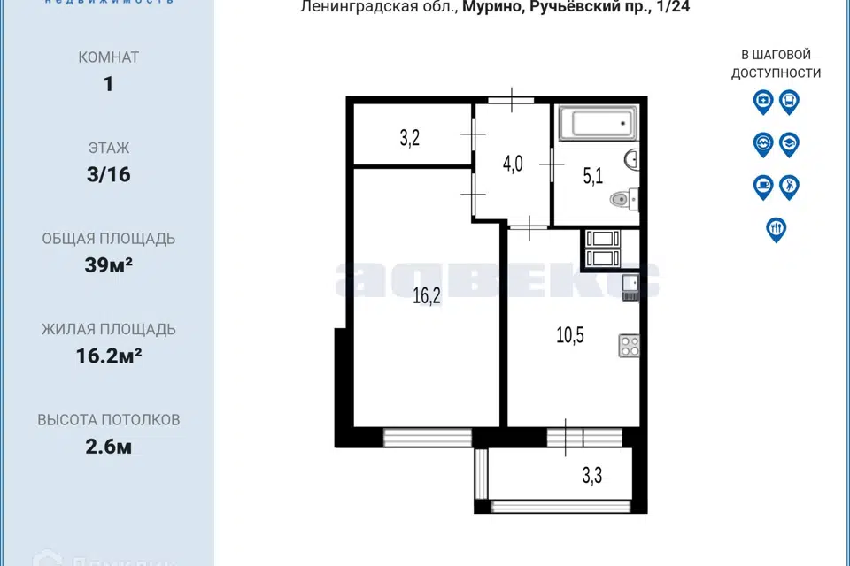 1-комн. кв., 39 м², 3/16 этаж