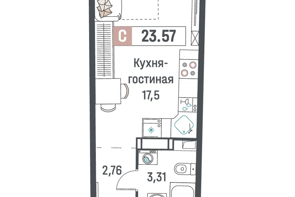 Студия, 27.75 м², 12/22 этаж