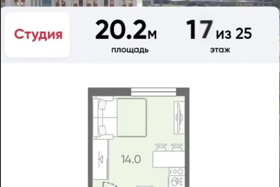 Студия, 20.2 м², 17/25 этаж
