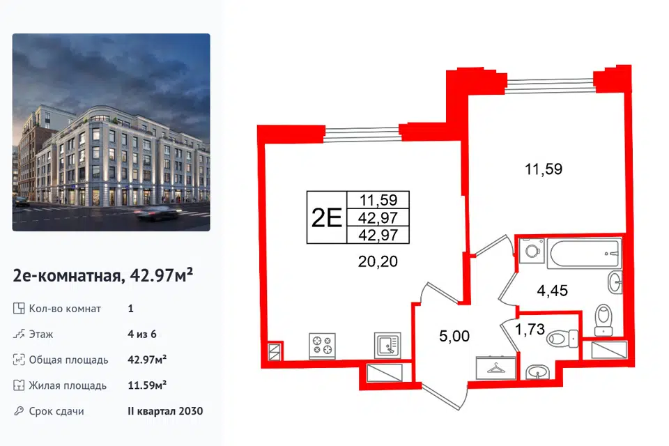 1-комн. кв., 42.97 м², 4/1 этаж