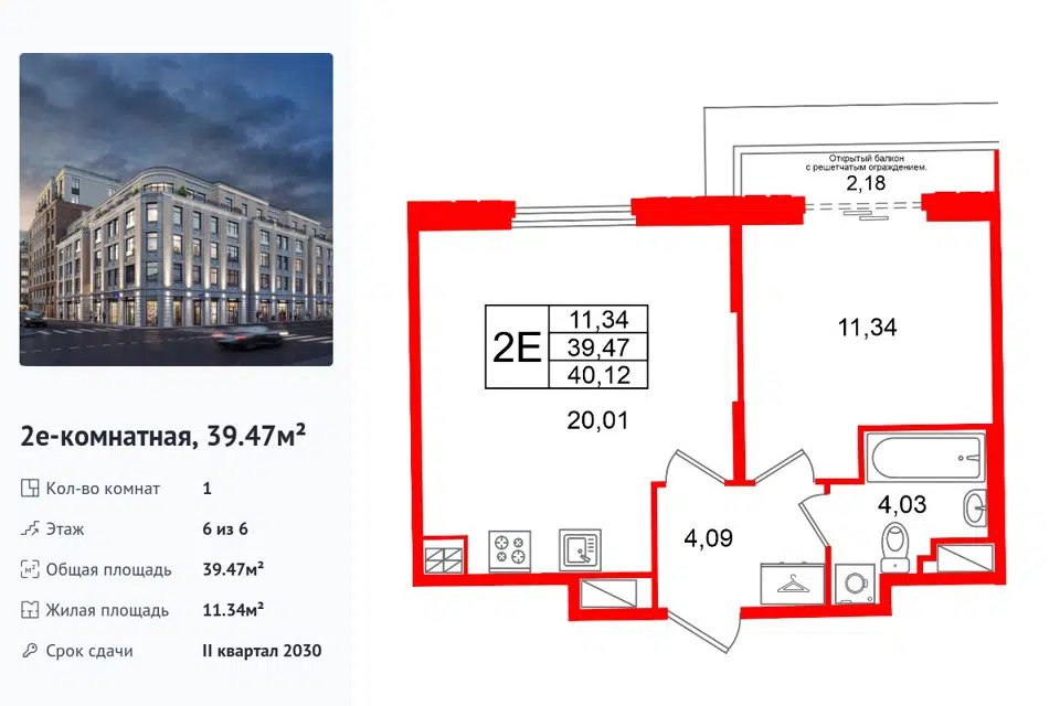 1-комн. кв., 39.47 м², 6/1 этаж
