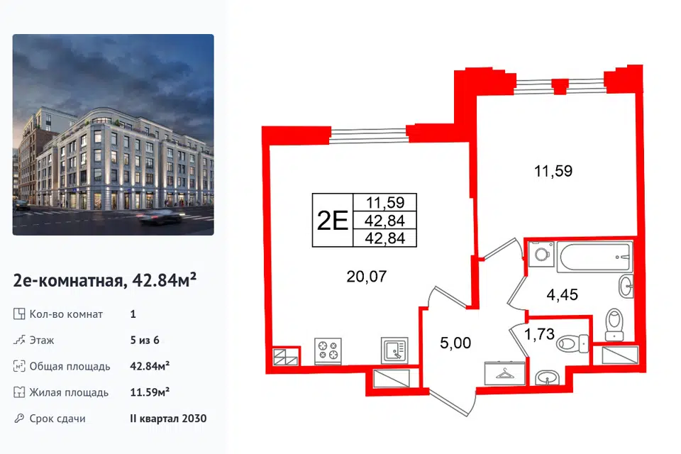 1-комн. кв., 42.84 м², 5/1 этаж