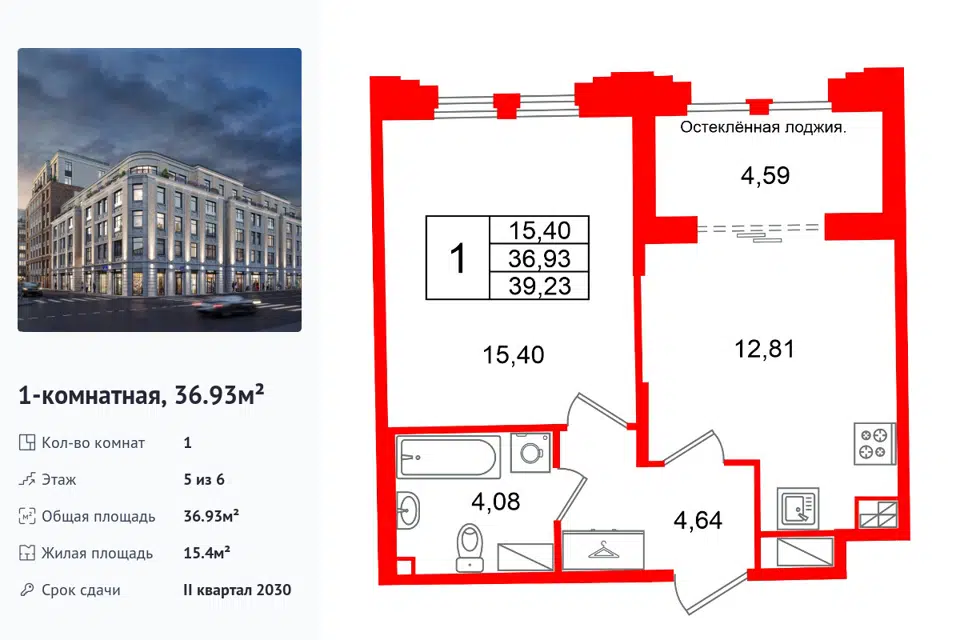 1-комн. кв., 36.93 м², 5/1 этаж