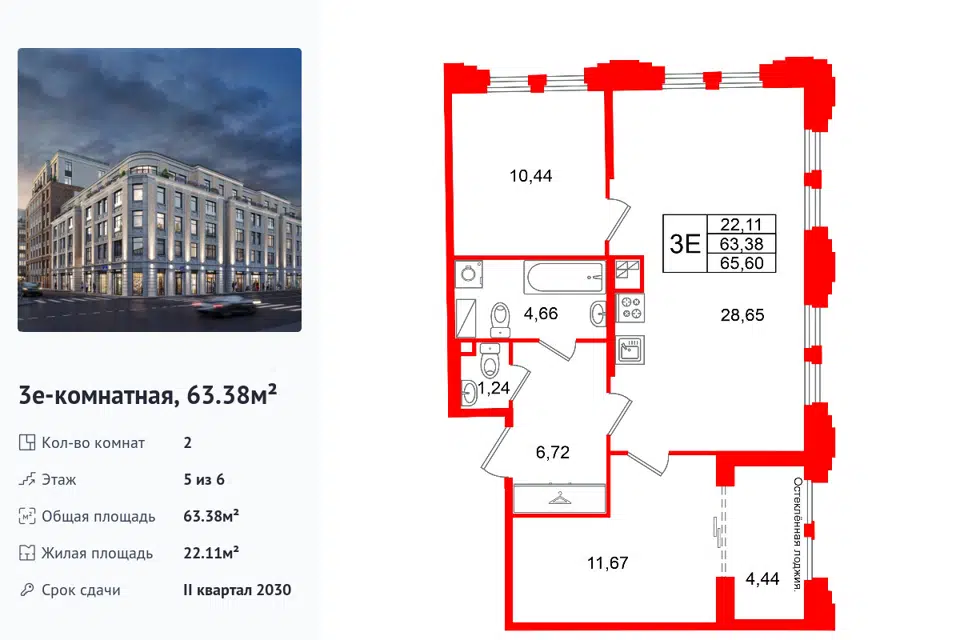 2-комн. кв., 63.38 м², 5/1 этаж