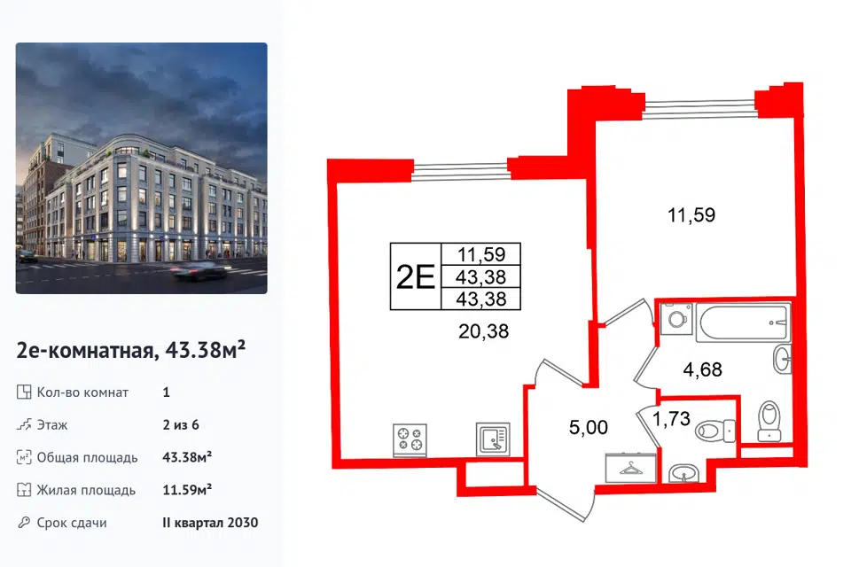 1-комн. кв., 43.38 м², 2/1 этаж