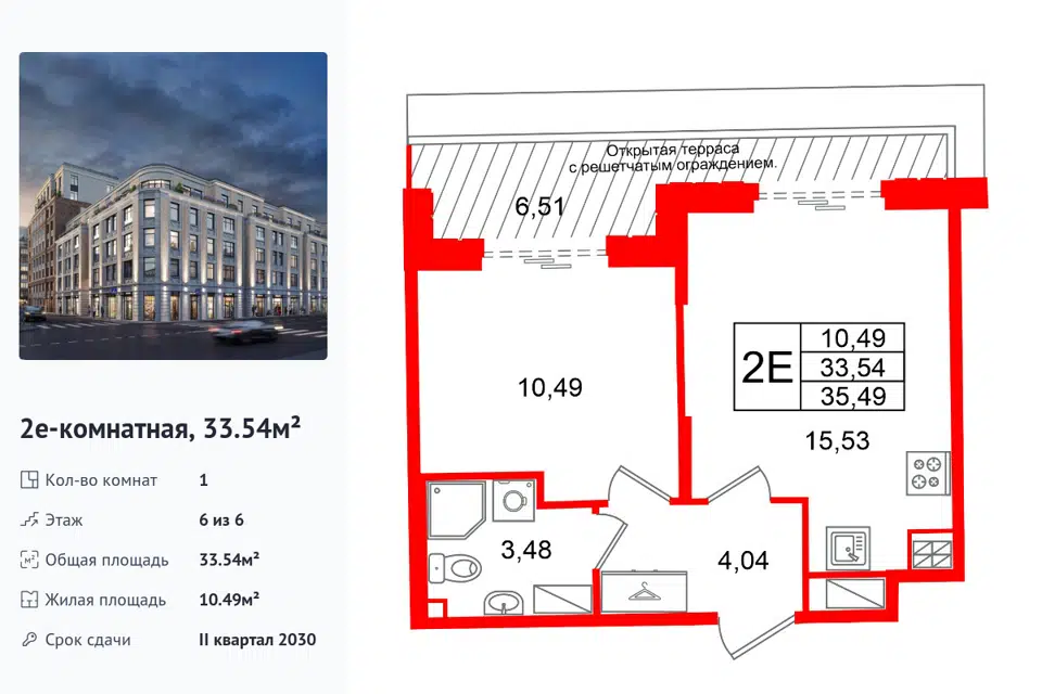 1-комн. кв., 33.54 м², 6/1 этаж