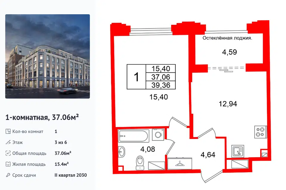 1-комн. кв., 37.06 м², 3/1 этаж