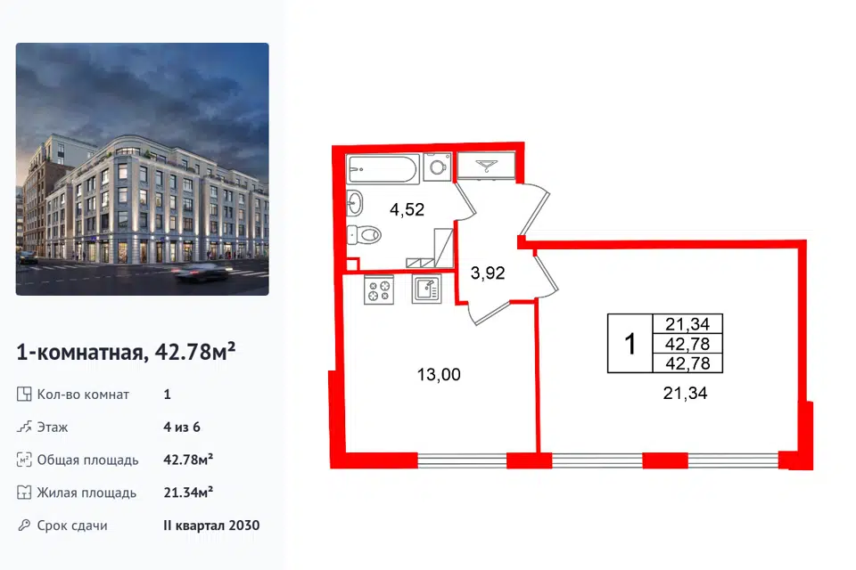 1-комн. кв., 42.78 м², 4/1 этаж