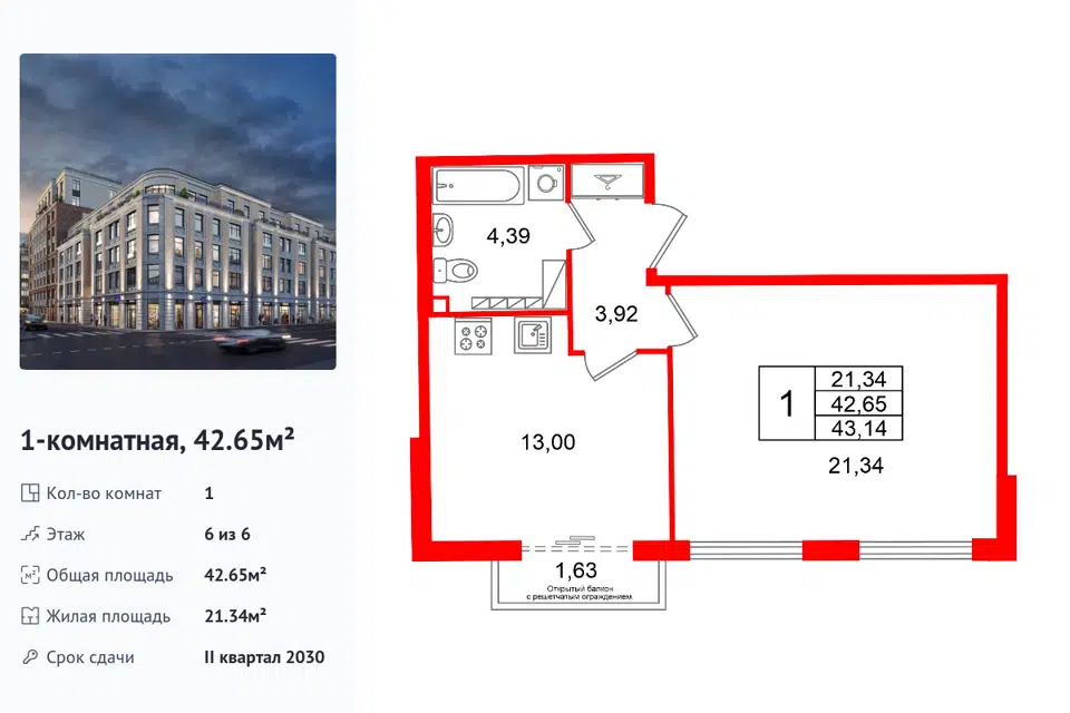1-комн. кв., 42.65 м², 6/1 этаж
