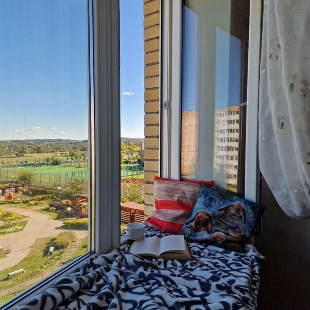 Комната с большой, уютной, застекленной лоджией, из которой видно Безымянное озеро. Озеро с благоустроенным пляжем находится в 15 мин ходьбы от дома.