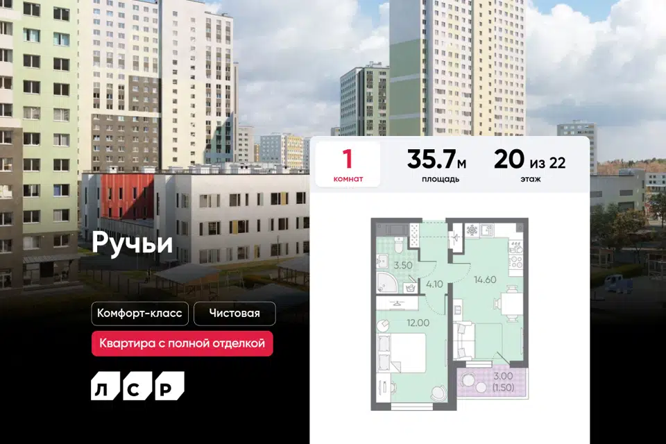 1-комн. кв., 35.7 м², 7/22 этаж