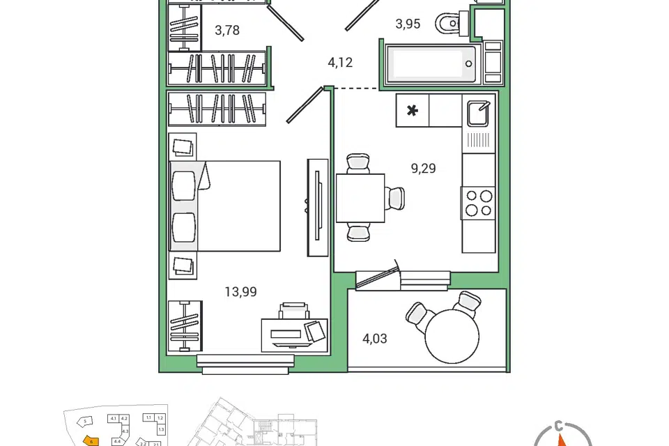 Студия, 22.2 м², 13/23 этаж