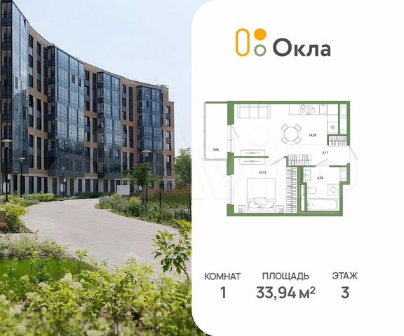 1-комн. кв., 33.9 м², 3/3 этаж