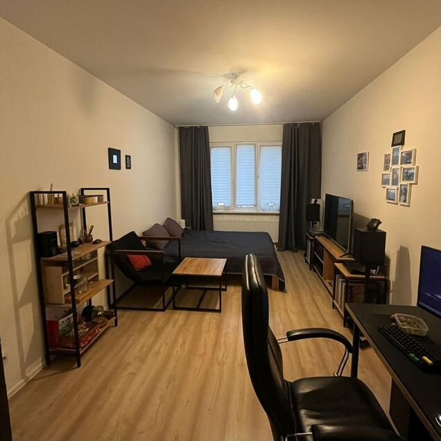 Очень теплая и уютная квартира с Ремонтом. Общая площадь- 22.2м+ застекленный балкон 3,5м, жилая комната 16м., сан узел совмещенный. Высокие потолки 2.7м.