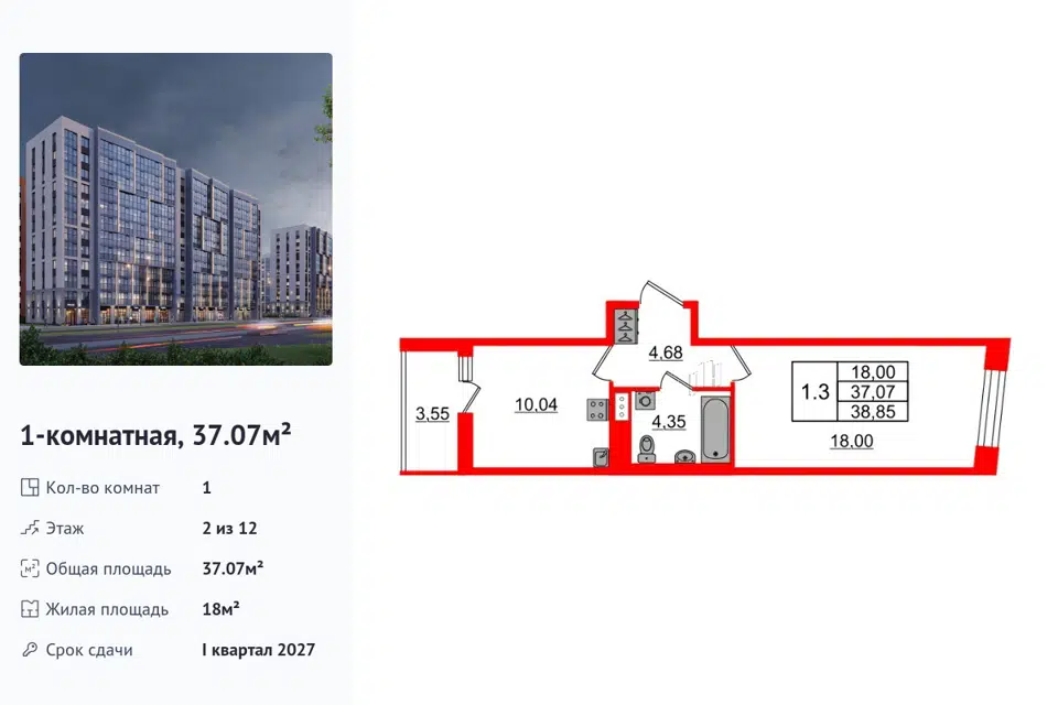 1-комн. кв., 32.9 м², 1/27 этаж