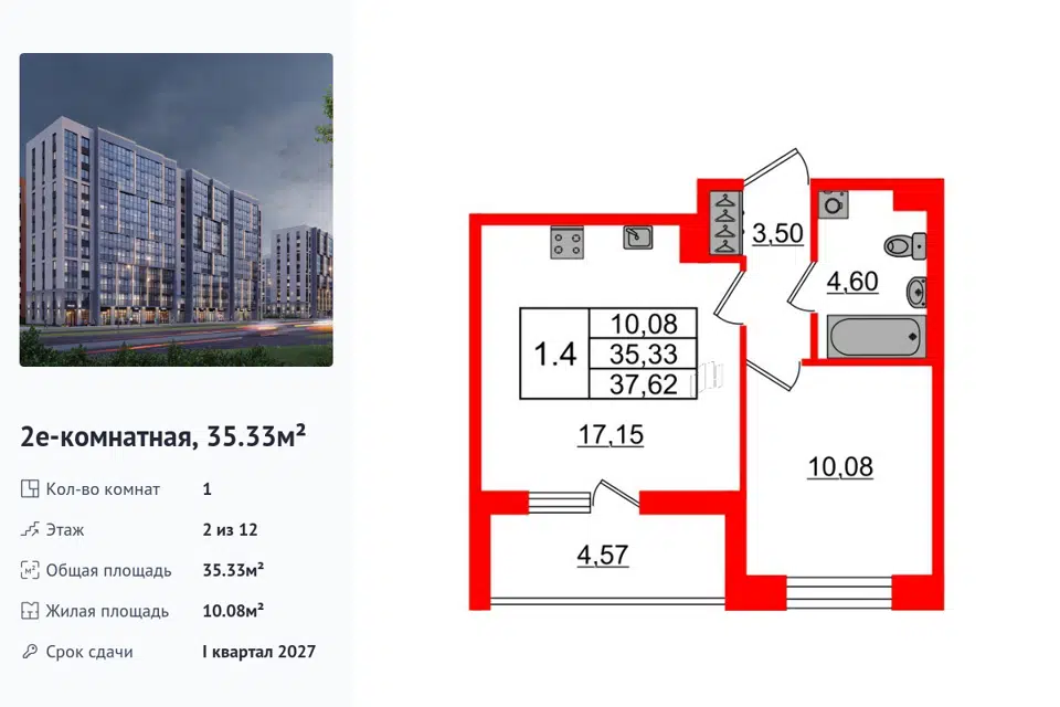 1-комн. кв., 35.33 м², 2/1 этаж