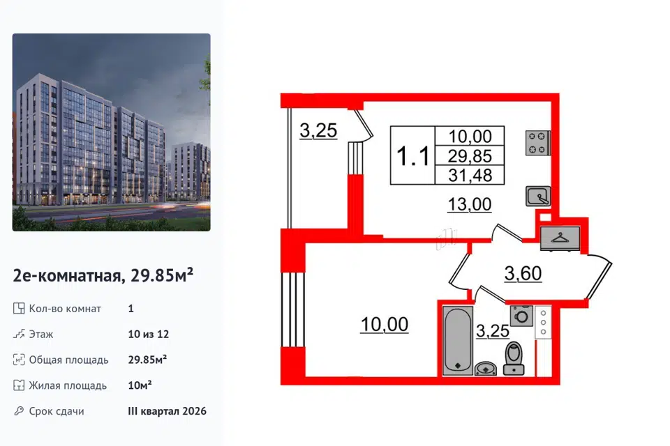 1-комн. кв., 29.85 м², 10/14 этаж
