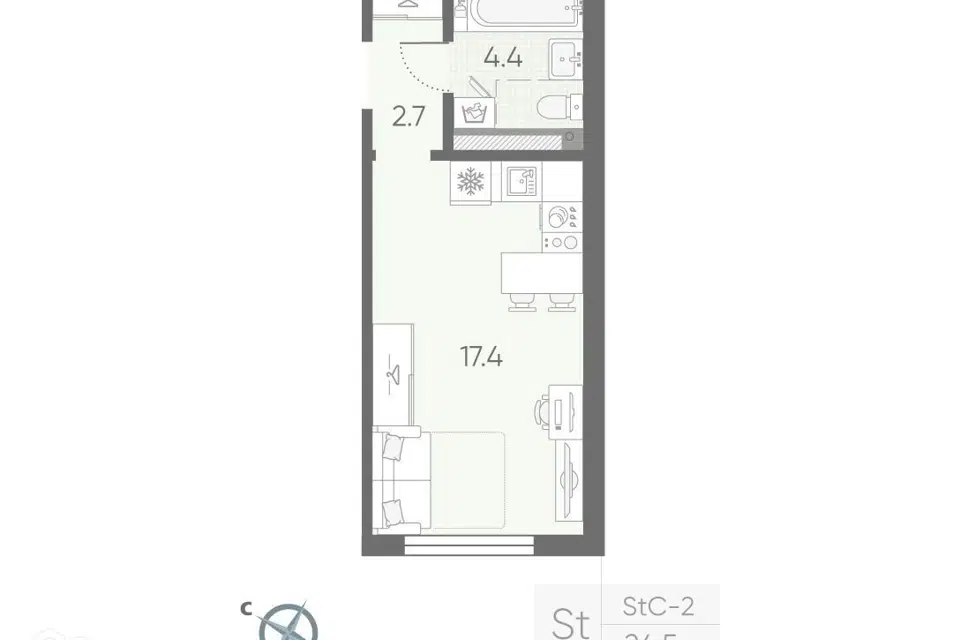 Студия, 24.7 м², 2/4 этаж