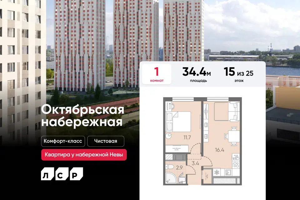 1-комн. кв., 34.4 м², 9/26 этаж