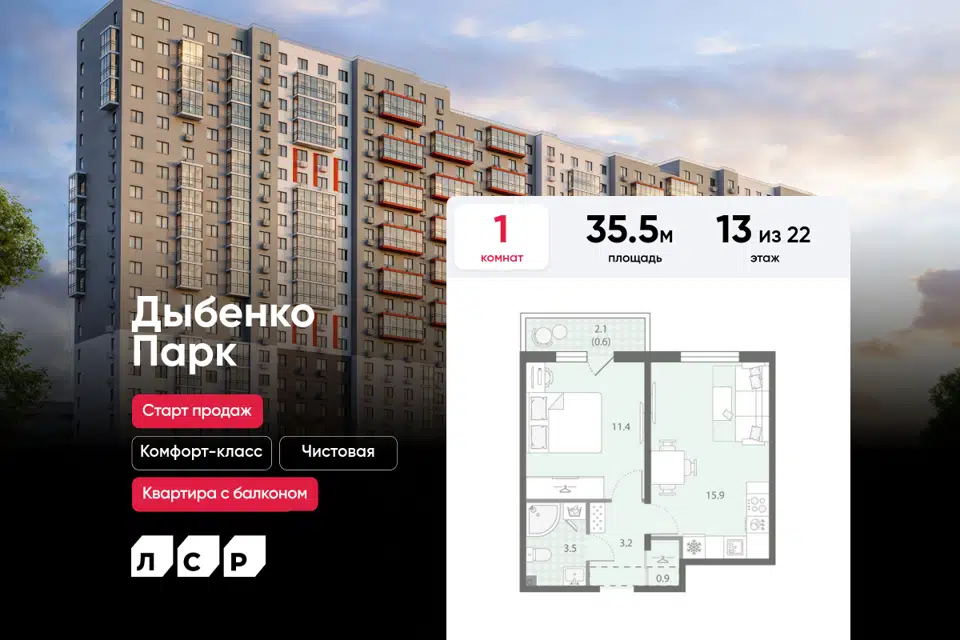 1-комн. кв., 35.5 м², 13/22 этаж