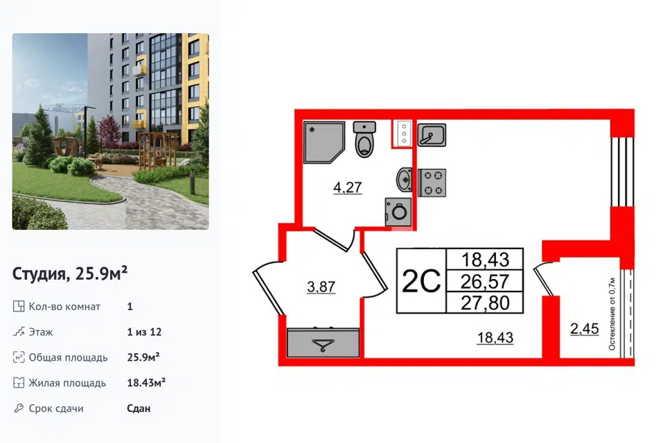 Студия, 25.9 м², 1/1 этаж
