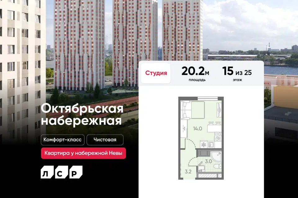 Студия, 20.2 м², 15/25 этаж