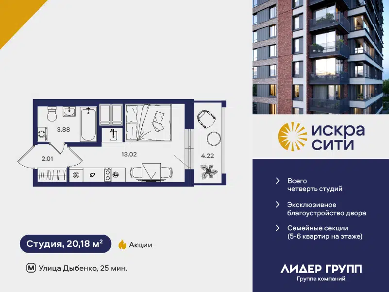 Студия, 20.18 м², 13/18 этаж