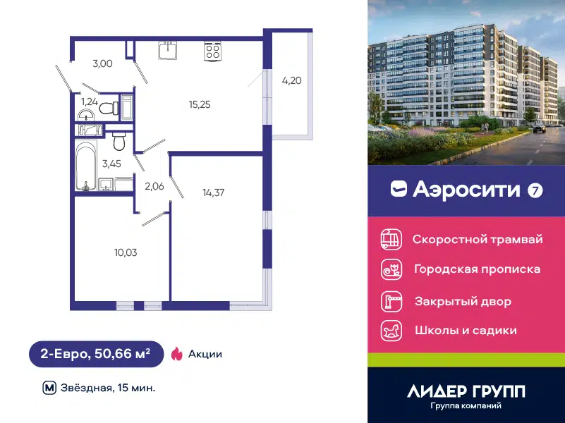 2-комн. кв., 50.4 м², 15/24 этаж