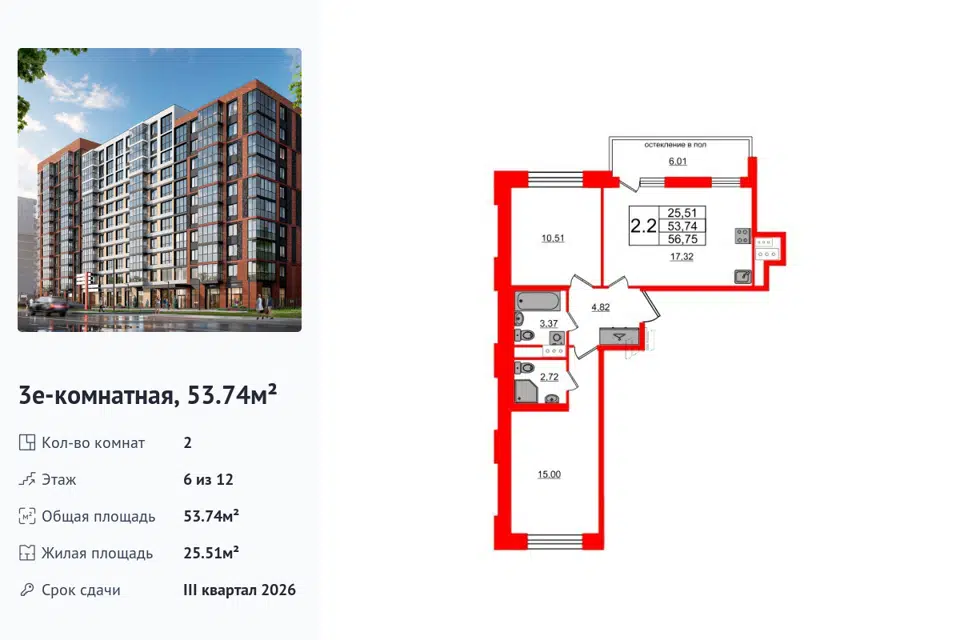 2-комн. кв., 52.3 м², 5/12 этаж