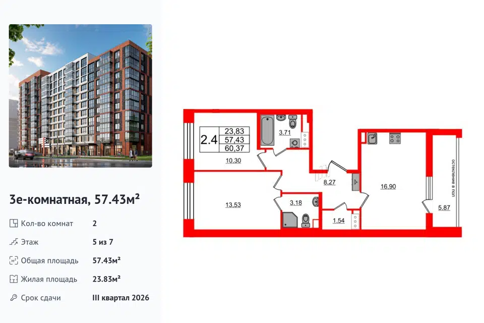 2-комн. кв., 57.43 м², 5/1 этаж