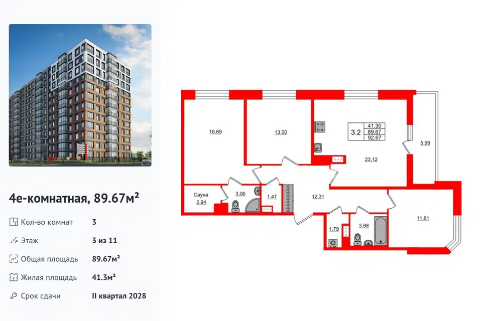 3-комн. кв., 89.67 м², 3/14 этаж