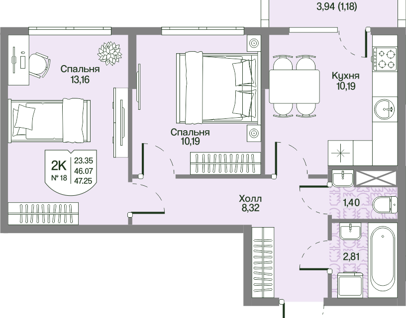 2-комн. кв., 46.07 м², 2/4 этаж