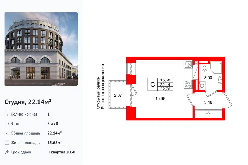 Студия, 22.14 м², 3/1 этаж