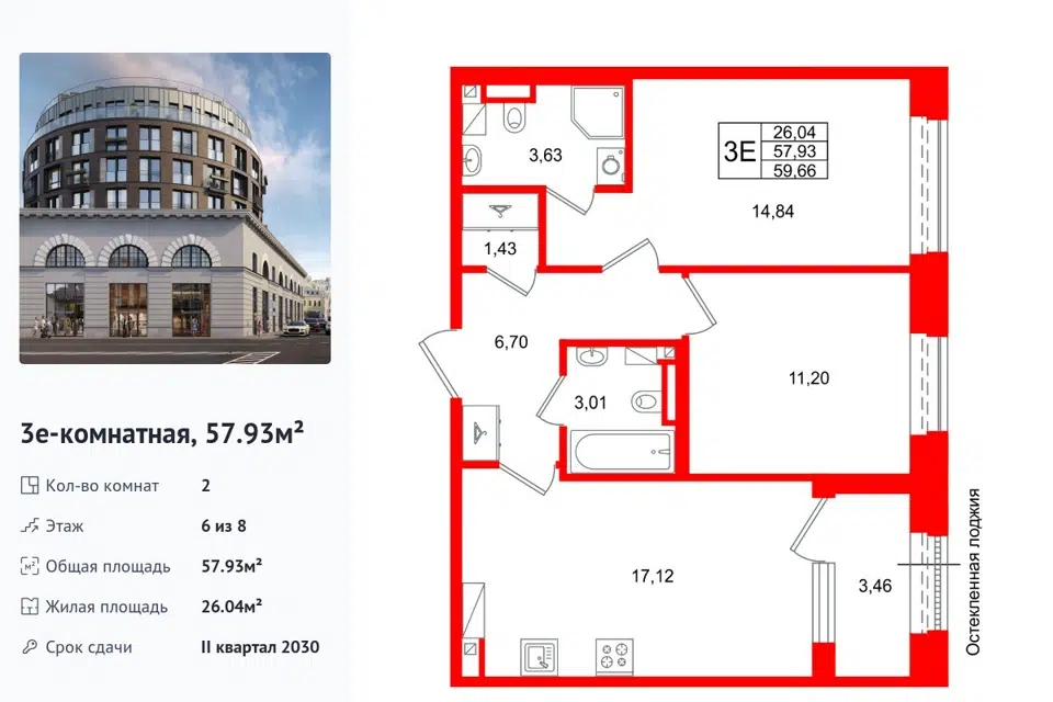 2-комн. кв., 57.93 м², 6/1 этаж