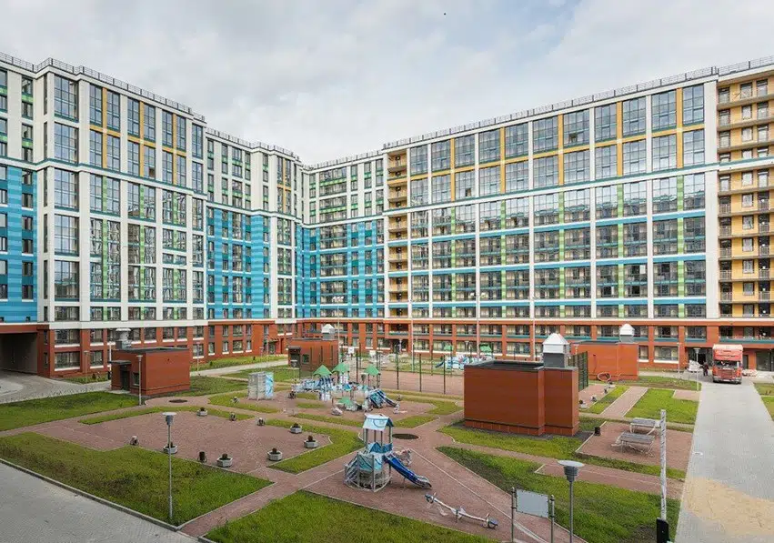 - На территории проекта оборудованы детские и спортивные площадки, имеется собственный многофункциональный стадион и детский сад.