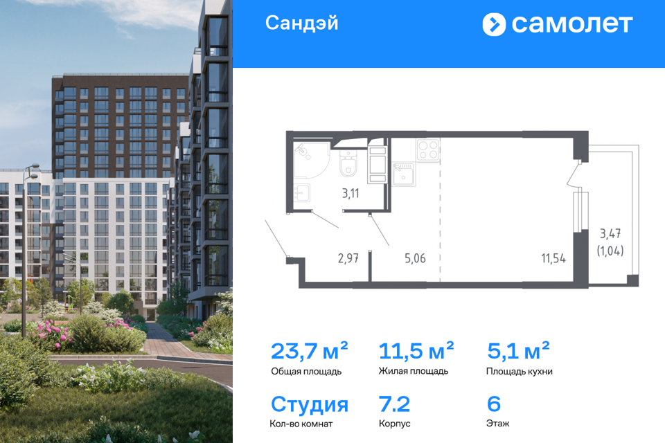 Студия, 23.72 м², 6/17 этаж