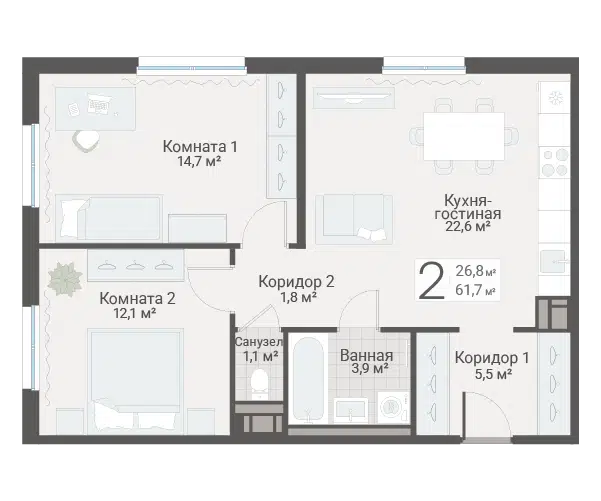 2-комн. кв., 61.7 м², 1/13 этаж