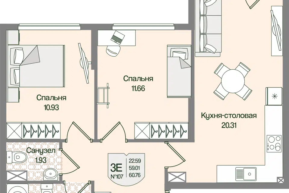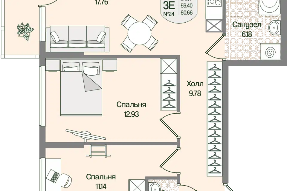 2-комн. кв., 60.66 м², 3/4 этаж