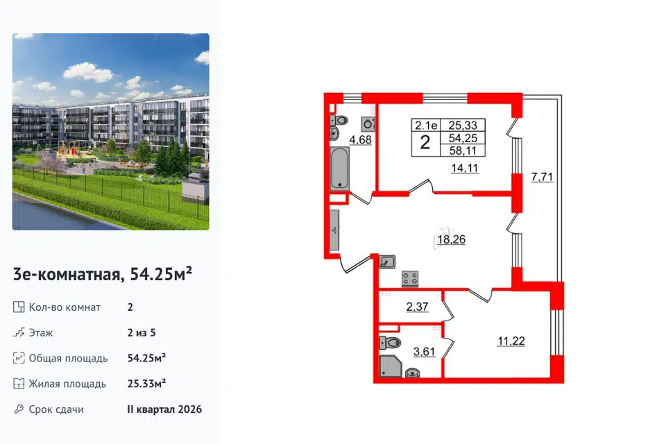 2-комн. кв., 54.25 м², 2/1 этаж