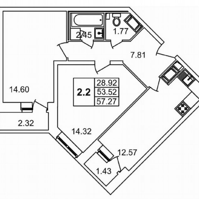 2-комн. кв., 57.3 м², 22/24 этаж